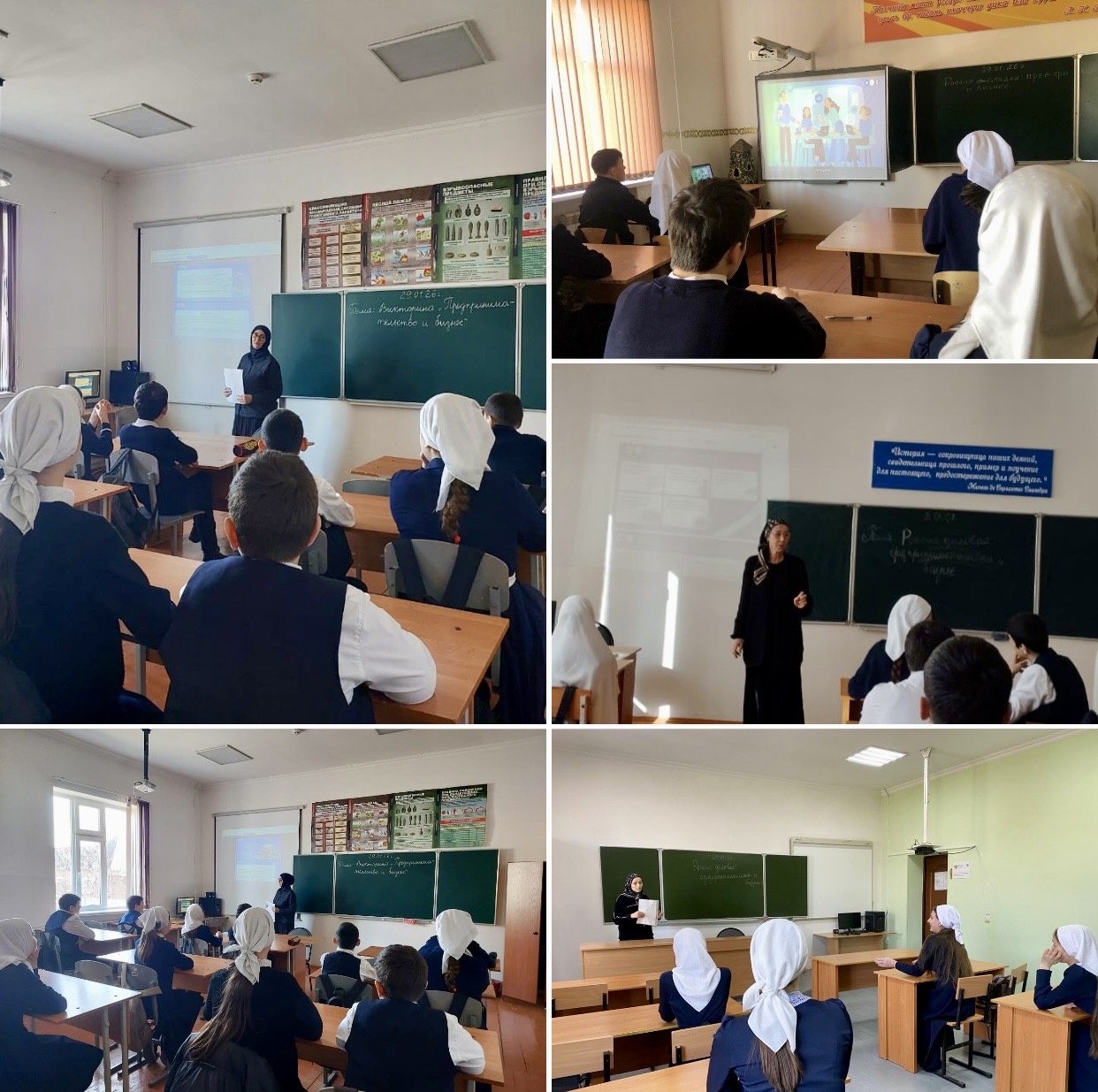 29.01.202629 января в МБОУ «СОШ № 9 г. Ачхой-Мартан» для учащихся 6-11 классов прошли профориентационные занятия в рамках всероссийского проекта «Россия – мои горизонты» на тему: «Россия деловая: предпринимательство и бизнес». Классный руководитель продемонстрировала слайды, для проведения викторины. Обучающиеся узнали, кто такой предприниматель, маркетолог, фельдшер. Они активно отвечали на вопросы. Также в конце им были предложены задания на карточках